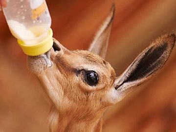 For the first two weeks, feed fawns four times a day, then reduce to three feedings a day for the next six weeks. In the final month, reduce to two feedings a day for two weeks, and then one feeding a day for the last two weeks. In the first two weeks, fawns should consume around 400–600 ml per day, gradually increasing to 1000–1200 ml per day in the 8th or 9th week. Before feeding, warm the formula and use a funnel to pour it into two baby bottles per fawn. Hold the bottles high, as fawns would eat from a standing mother, and pull and push them back and forth as you feed. To stimulate suckling and get the fawn used to the taste of milk, you can try firmly forcing the teat into its mouth. Please note: goats milk is recommended for feeding your exotic baby. Before feeding, heat up the formula.